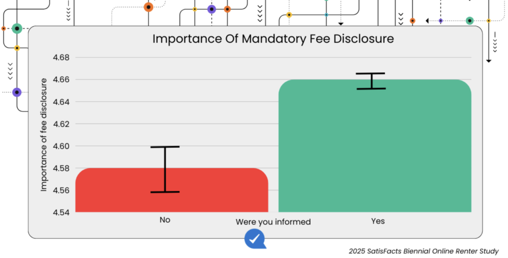 - Fee transparency is the top information need. “Information on mandatory fees beyond the advertised rent” ranked #1 again, scoring 4.64/5 in 2025 (vs. 4.74/5 in 2023). Importance dipped slightly—but it still leads every other information item.